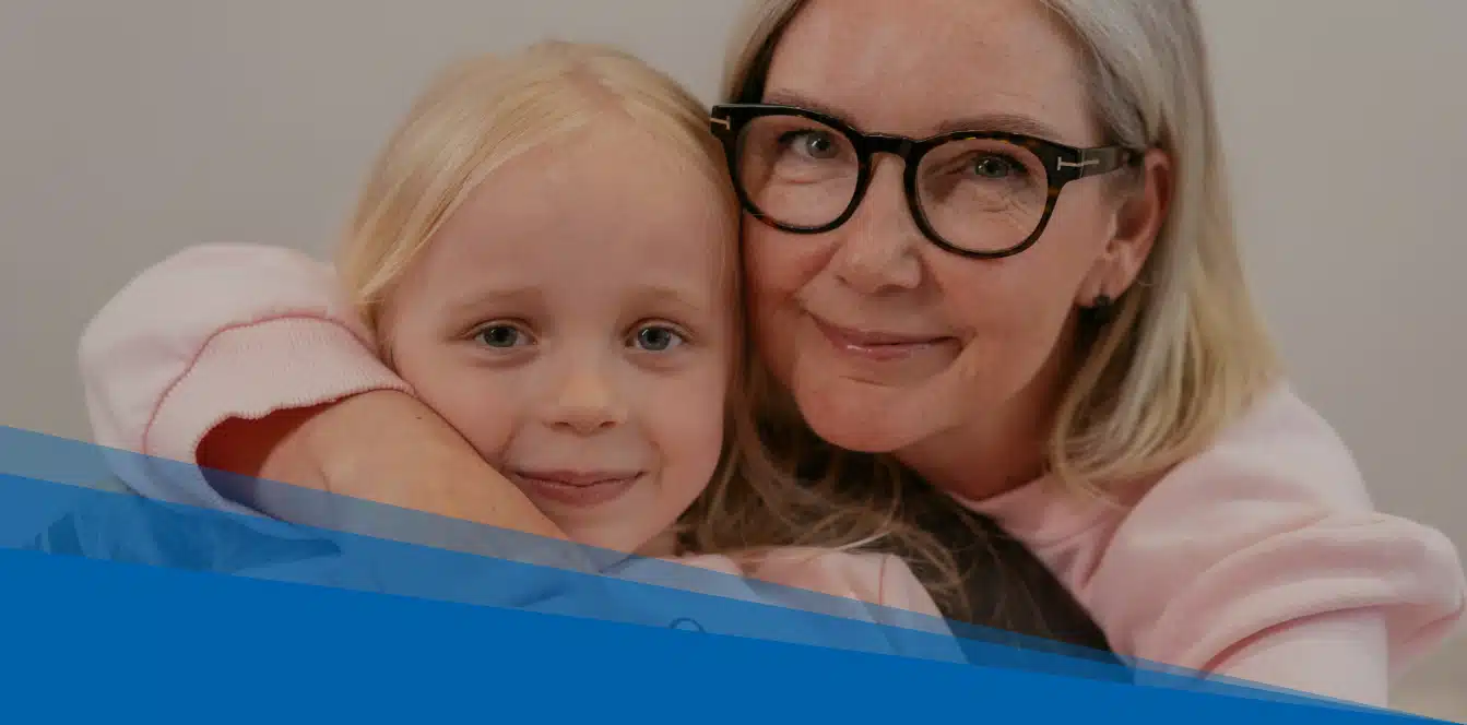 Oma mit schwarzer Brille umarmt ca. 5 jähriges Mädchen von hinten